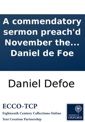 A commendatory sermon preach'd November the 4th, 1709. Being the birth-day of King William, of glorious memory. By Daniel de Foe, Daniel Defoe. A commendatory sermon preach'd November the 4th, 1709. Being the birth-day of King William, of glorious memory. By Daniel de Foe Defoe, Daniel, 1661?-1731. 8p. ; 8⁰. London : printed by J. Dutton, [1709] Largely reprinted from the 'Review' of 5 November 1709. Reproduction of original from the British Library. Moore, 162 English Short Title Catalog, ESTCT56875. Electronic data. Farmington Hills, Mich. : Thomson Gale, 2003. Page image (PNG). Digitized image of the microfilm version produced in Woodbridge, CT by Research Publications, 1982-2002 (later known as Primary Source Microfilm, an imprint of the Gale Group).Review: